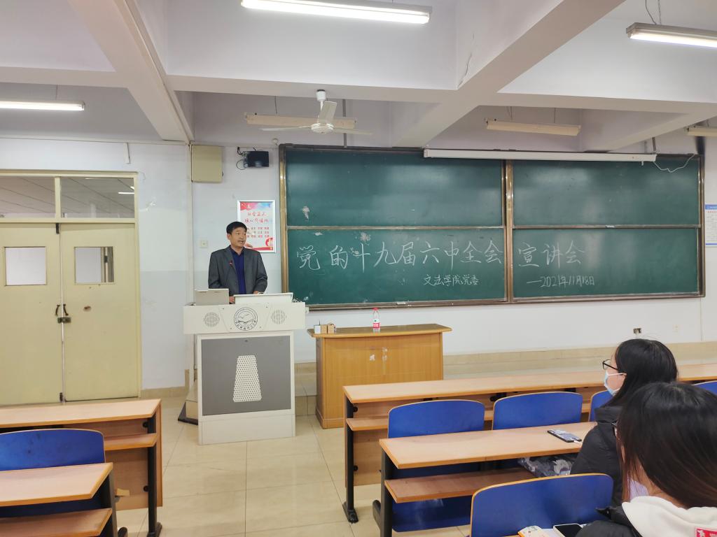 11月18日下午,永利yl23455组织召开党的十九届六中全会精神宣讲会,党委书记郝东主持宣讲活动,全体党员通过线上、线下两种方式参加了学习活动。