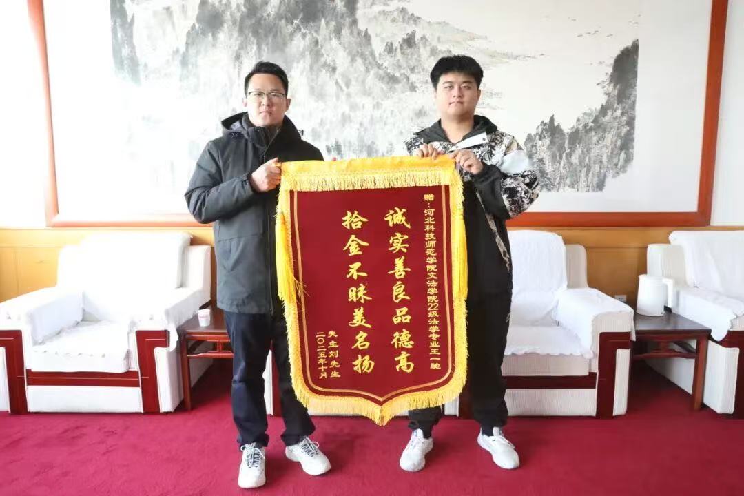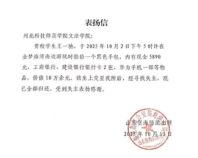 事情还要从半个月前说起10月2日王一驰在秦皇岛金梦海湾沙滩玩耍突然看到前方不远处有一个黑色的手提包环顾四周,几乎没什么人,他断定应该是哪位游客遗忘在这里的当时包里有厚厚一沓现金、一部手机还有几张银行卡,王一驰提着包在原地等了十来分钟始终没人来认领他又提着包到处寻找失主依然没有结果,正一筹莫展时前方走来两位执勤民警他连忙走上前将事情经过详细告知山东堡海防派出所民警商严和同事接过手提包简单清点了包内资产估算总价值超10万元他们夸赞王一驰“拾金不昧,好样的!”并询问了他的个人信息,商严和同事将手提包带回派出所后通过多种方式,很快联系上了失主失主认领时激动不已几天后失主到派出所送来一面锦旗反复恳请民警一定转送给恩人10月15日商严将这面锦旗和派出所出具的表扬信一并送到永利yl23455保卫科由永利yl23455老师最终转送给了王一驰。
