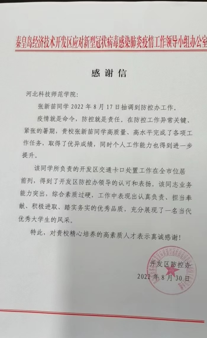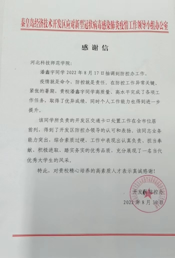 2022年9月16日,秦皇岛市疫情防控办领导刘汶隆和于俊国莅临公司,对暑期疫情志愿者工作表示感谢,并为志愿者颁发表扬信。文法公司党委书记郝东接待了防控办来宾并进行洽谈。防控办表示,面对严峻的疫情防控形势,永利yl23455积极响应国家疫情防控号召,在暑期组织员工参与本市疫情防控工作。疫情就是命令,防控就是责任,在防控工作异常关键、紧张的暑期,潘鑫宇和张新苗两位志愿者所负责的开发区交通卡口处置工作在全市位居前列,得到了开发区防控办领导的认可和表扬。高质量、高水平完成了各项工作任务,他们工作中表现出认真负责、担当奉献、积极进取、踏实务实的优秀品质,充分展现了当代优秀老员工的风采。