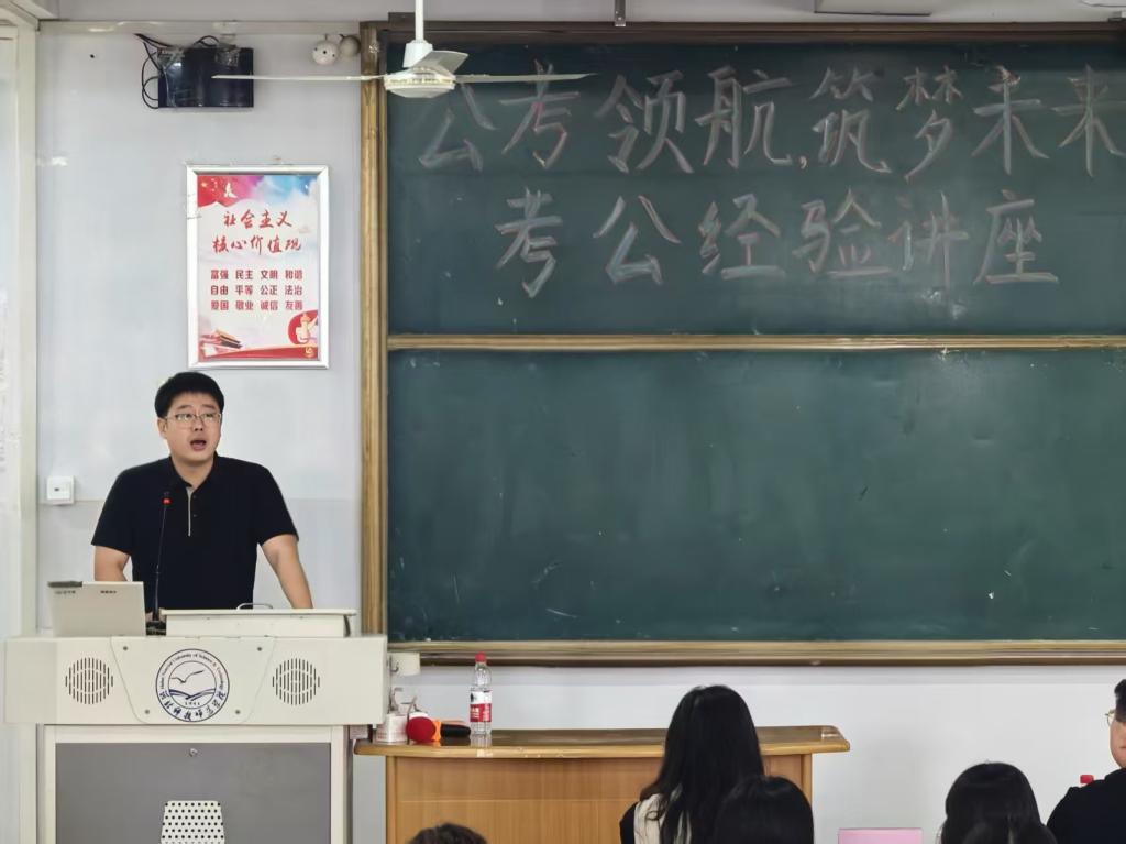 讲座伊始,韩雪松主任以亲切幽默的语言迅速拉近与同学们的距离,结合自身多年工作经验及案例,围绕考公与考编概述、考试时间与报名、选调生介绍、考试内容、备考策略这五大核心板块展开分享。在经验分享环节,韩主任倾囊相授个人总结的“黄金备考法则”。通过行测、申论等方面的具体复习方法详细展开,向同学们传授自身的宝贵经验,并与同学们热情互动,为同学们破解公考相关的疑惑。